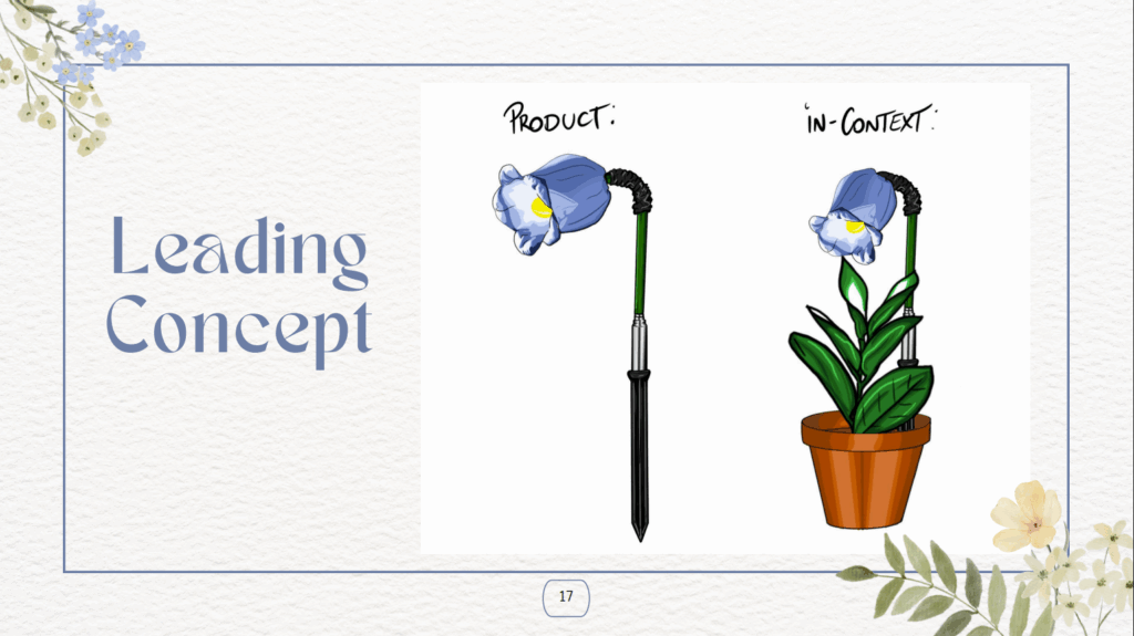 For the leading concept we chose something that all three of us had thought of which was a stick into the pot that looks like a plant. To create this model, I 3D printed both the flower and the stake. For the adjustable arm, we repurposed a telescopic tool magnet by removing the magnet at the end. We also used a flexible plastic gooseneck containing a metal wire, which allows the angle to be adjusted as needed. The light was threaded through the gooseneck and inserted through the hole at the base of the flower.
